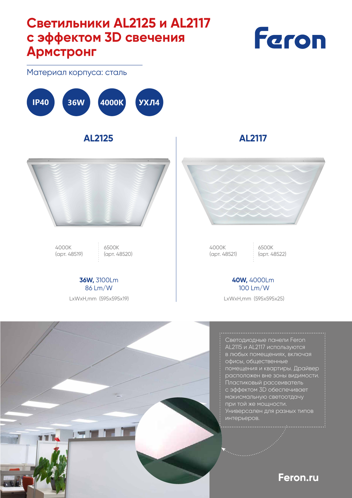 Корпус выполнен из штампованной стали, что обеспечивает прочность и долговечность. Рассеиватель из пластика с 3D эффектом добавляет стильный акцент в интерьер и эффективнее распределяет свет благодаря углу рассеивания 120°. Компактные размеры 595x595x19 мм и монтажное отверстие 595x595 мм позволяют без труда установить светильник в любых помещениях. С уровнем защиты IP40 данный светильник подходит для офисов, торговых площадей и других коммерческих объектов, соответствуя всем стандартам ГОСТ.