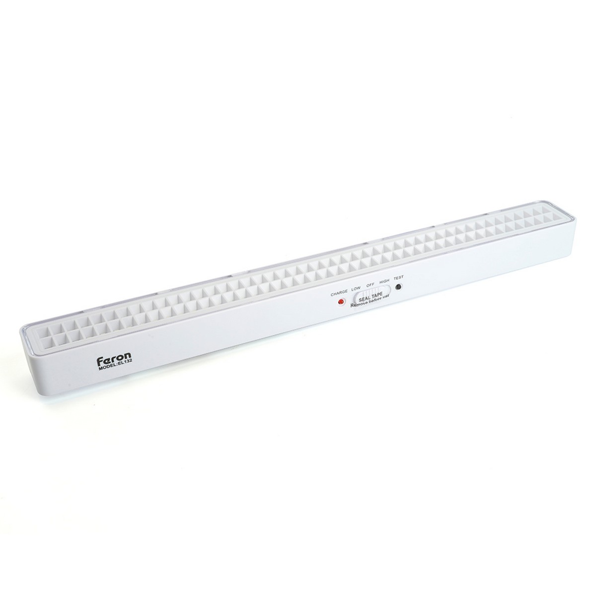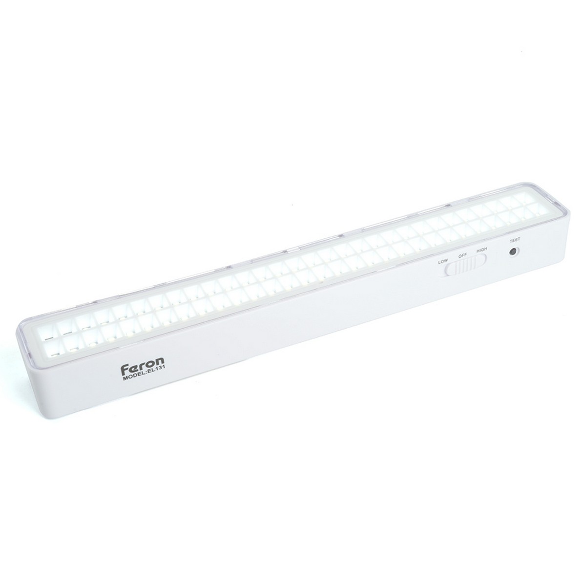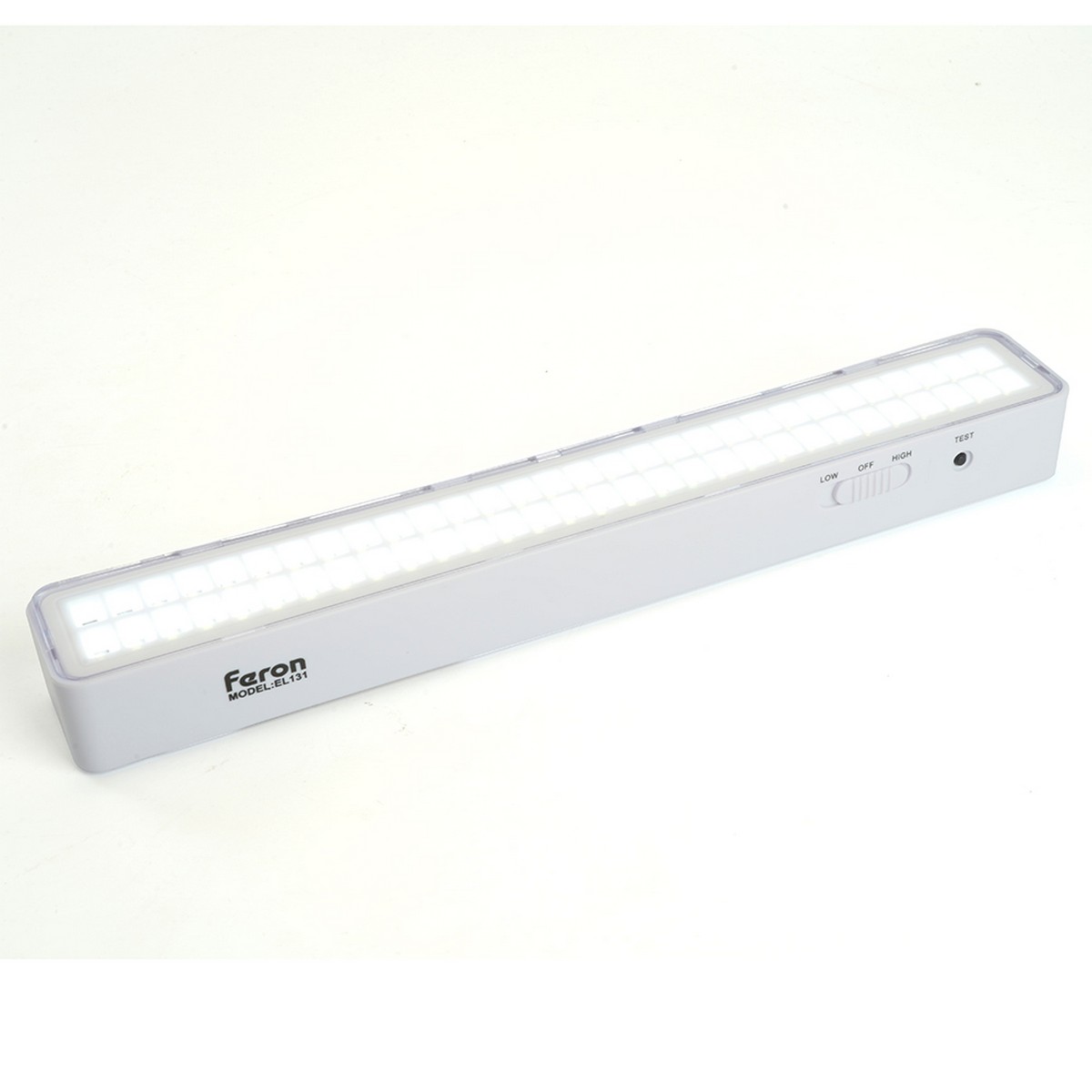 Светильник аккумуляторный FERON EL131 DC, 60LED/дневной, 100-240V, IP20, аккумулятор 3,7/1200mAh/Li-Ion (литий-ионный), количество режимов 2, время зарядки 24 часа, время работы 2/4часов, цвет белый, 280*43*28.2мм