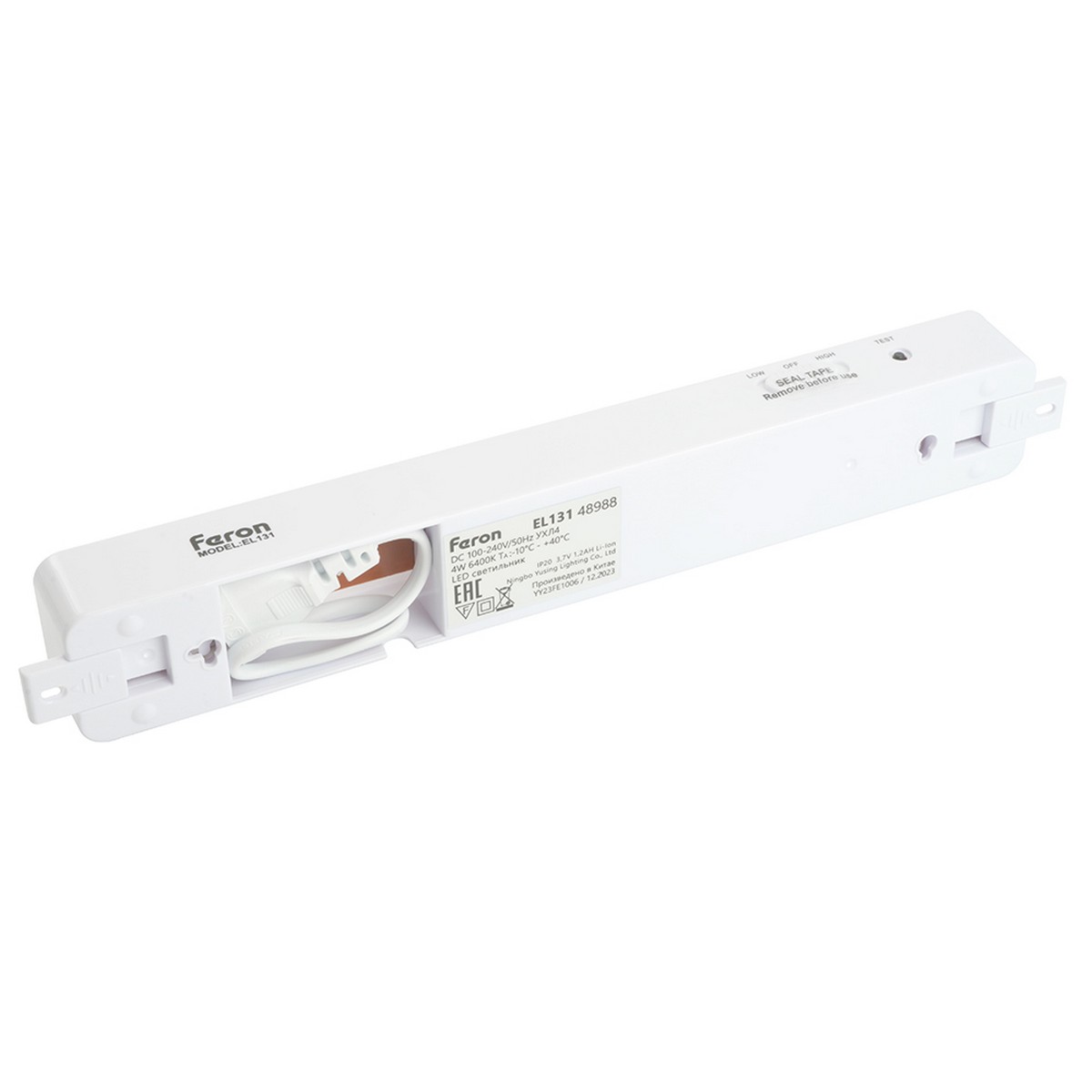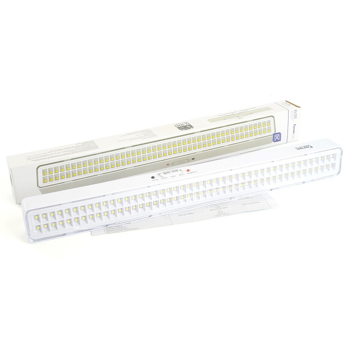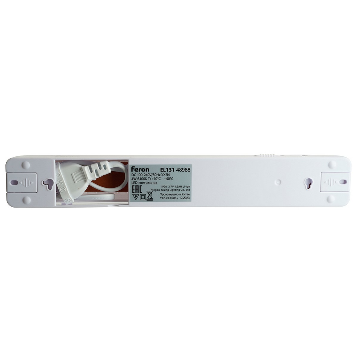 Светильник аккумуляторный FERON EL131 DC, 60LED/дневной, 100-240V, IP20, аккумулятор 3,7/1200mAh/Li-Ion (литий-ионный), количество режимов 2, время зарядки 24 часа, время работы 2/4часов, цвет белый, 280*43*28.2мм