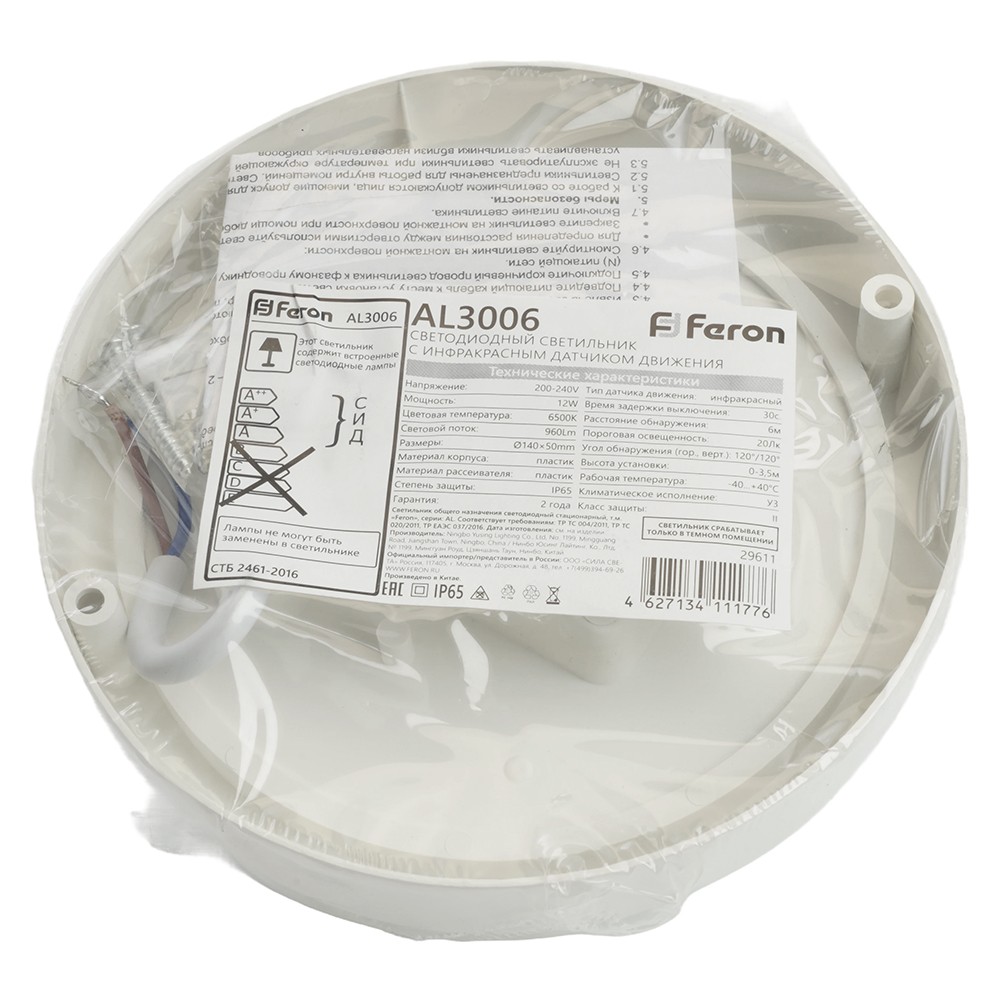 Пылевлагозащищённый светодиодный светильник AL3006 ТМ Feron артикул 29611 имеет встроенный инфракрасный датчик движения и предназначен для использования в помещениях с нерегулярной потребностью в освещении. Идеально подходит для сферы ЖКХ и коммунальных хозяйств.