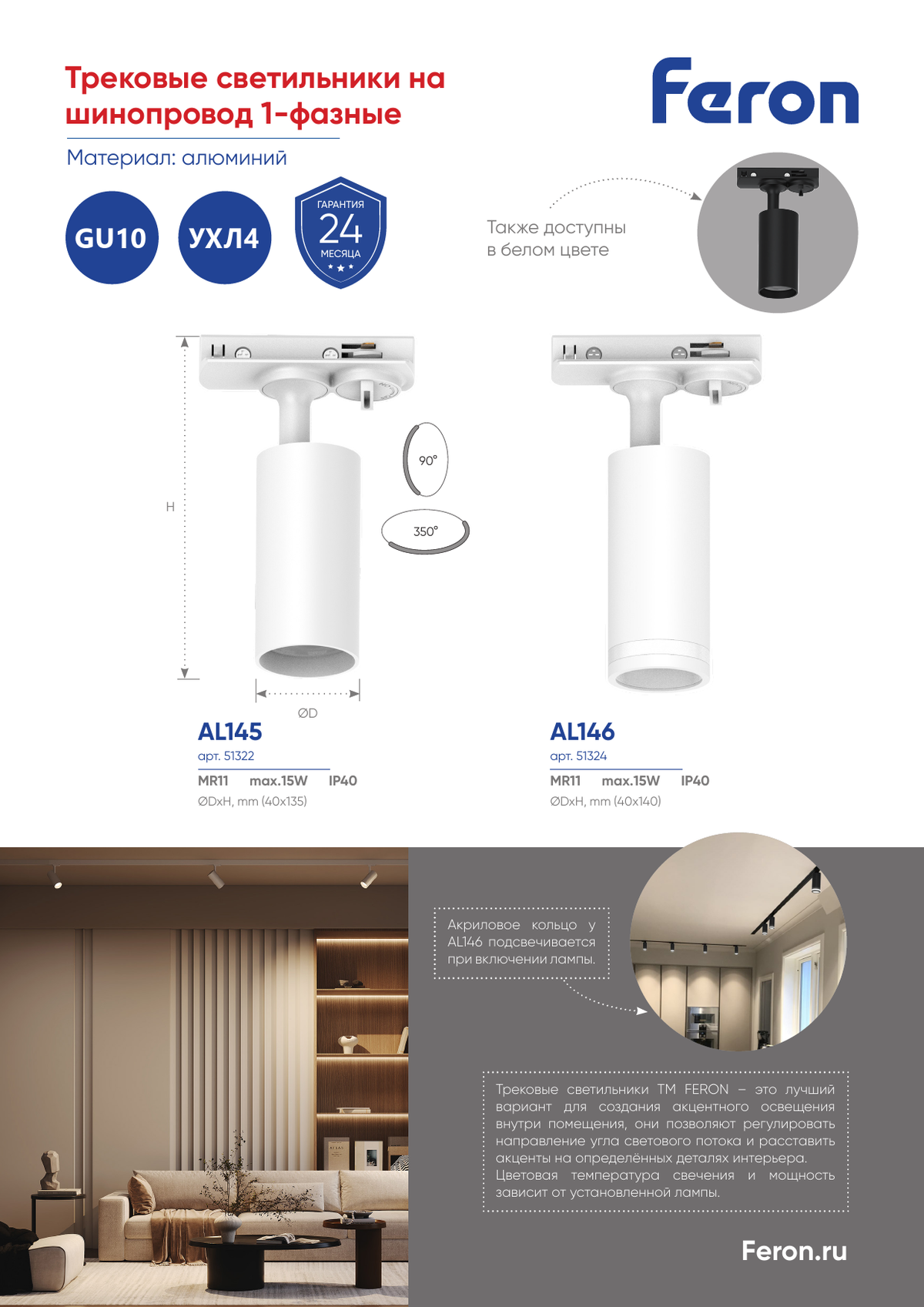 при включении лампы. Светильники трековые на шинопровод GU10, однофазный (ИВО) FERON AL146, 15W, 230V, цвет белый, корпус алюминий, вращение →350°/↓90°, 40*40*140 мм