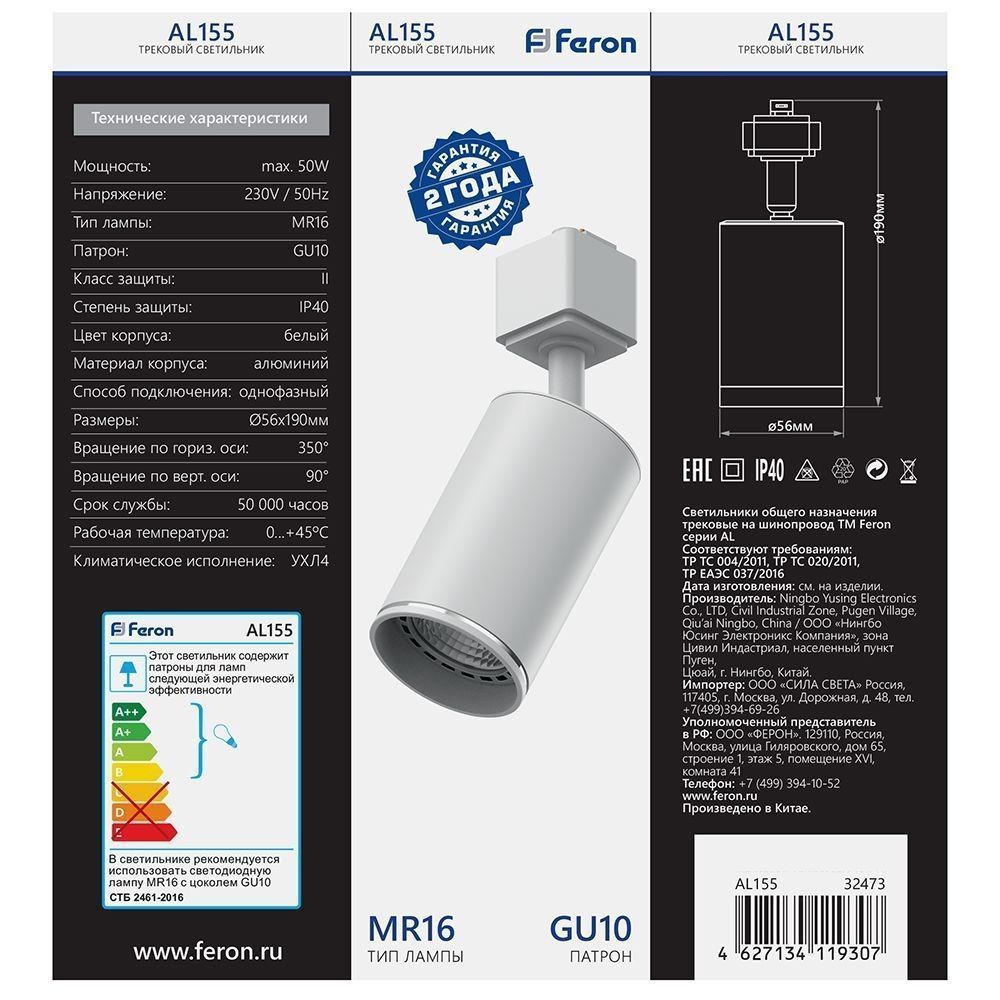 Трековые светильники AL155 TM FERON артикул 32473 предназначены для использования с лампами типоразмера MR16 и цоколем GU10.