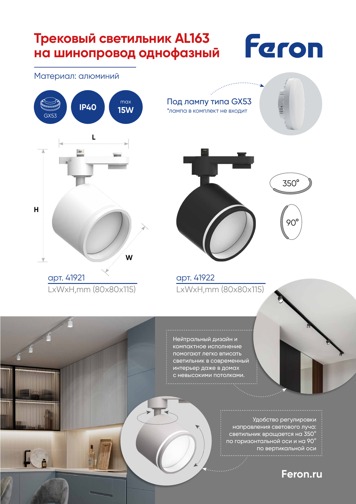 Светильник Feron AL163 трековый однофазный на шинопровод под лампу GX53 белый 41921 по цене 537 руб. с фотографией и техническими характеристиками. Для покупки товара нажмите кнопку "Купить" и перейдите в корзину или позвоните по телефону 8 (495) 585 32 60 или 8 (800) 222 23 53.