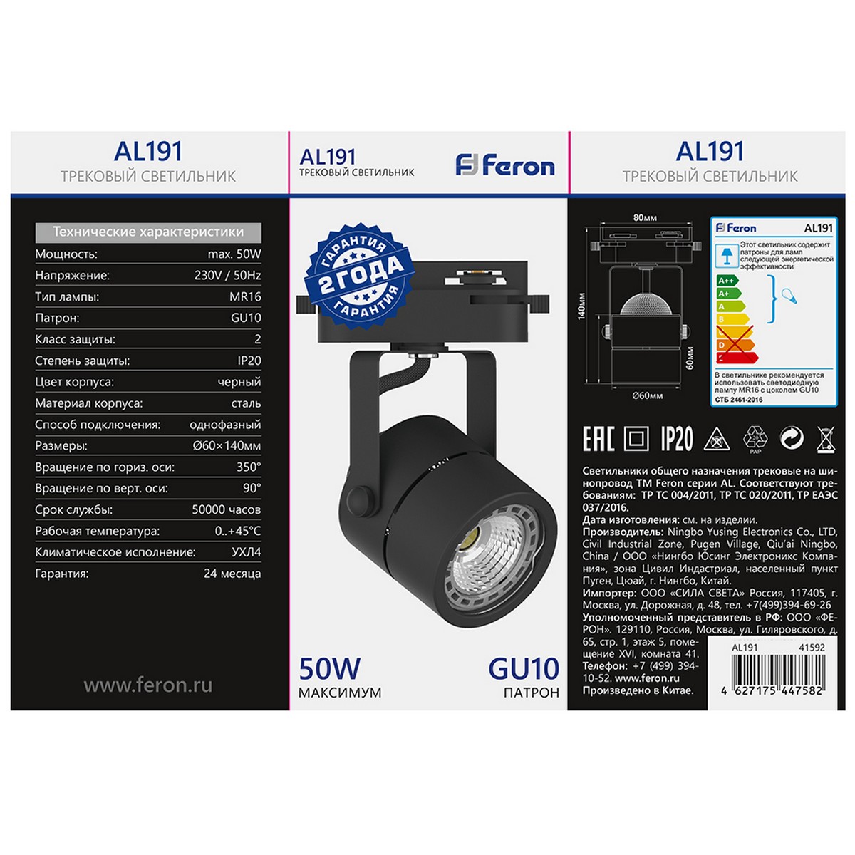 Светильник Feron AL191 трековый однофазный на шинопровод под лампу GU10 черный 41592 по цене 282 руб. с фотографией и техническими характеристиками. Для покупки товара нажмите кнопку "Купить" и перейдите в корзину или позвоните по телефону 8 (495) 585 32 60 или 8 (800) 222 23 53.