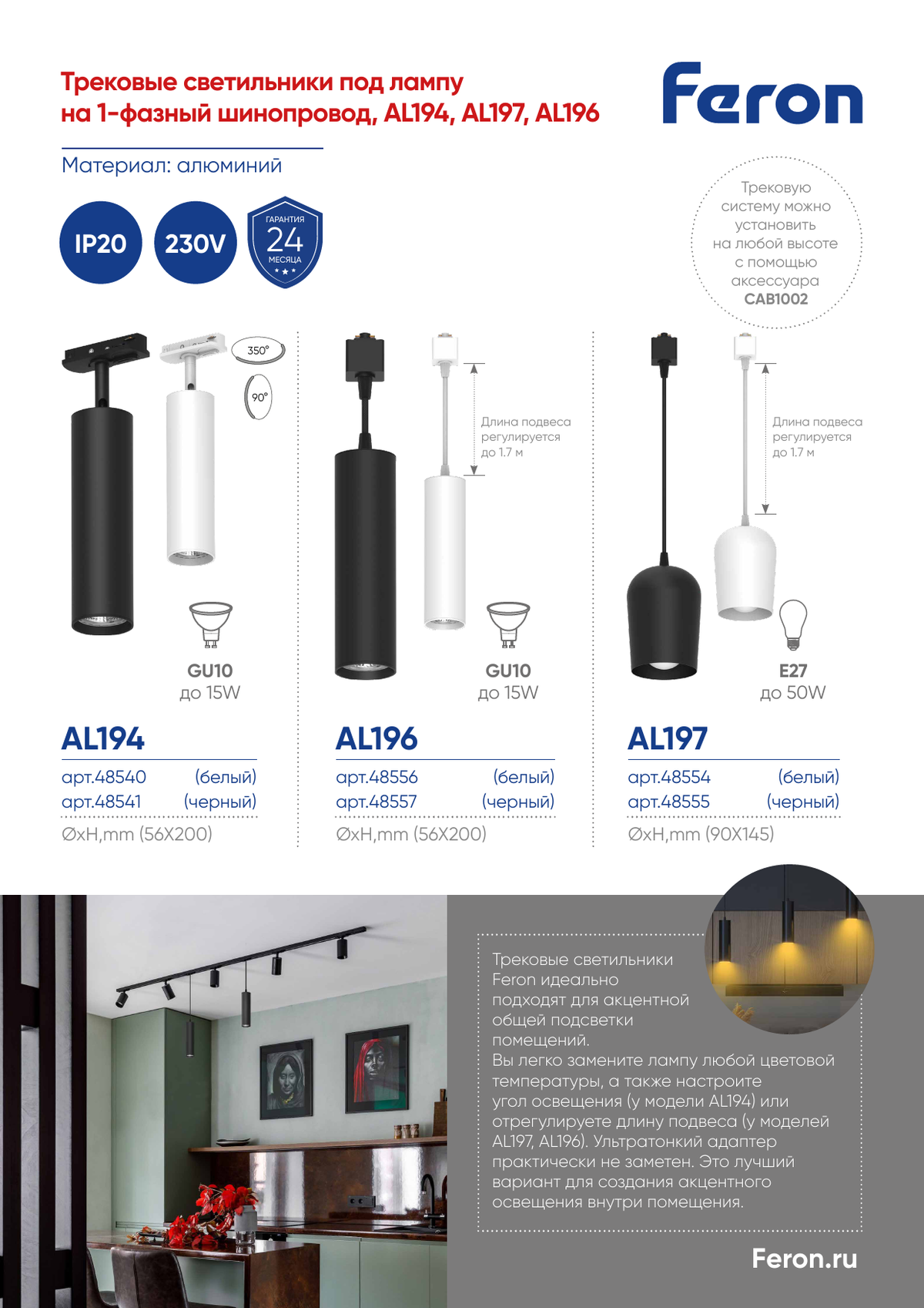 Светильник Feron AL196 трековый однофазный на шинопровод под лампу на подвесе GU10 белый 48556 по цене 943 руб. с фотографией и техническими характеристиками. Для покупки товара нажмите кнопку "Купить" и перейдите в корзину или позвоните по телефону 8 (495) 585 32 60 или 8 (800) 222 23 53.