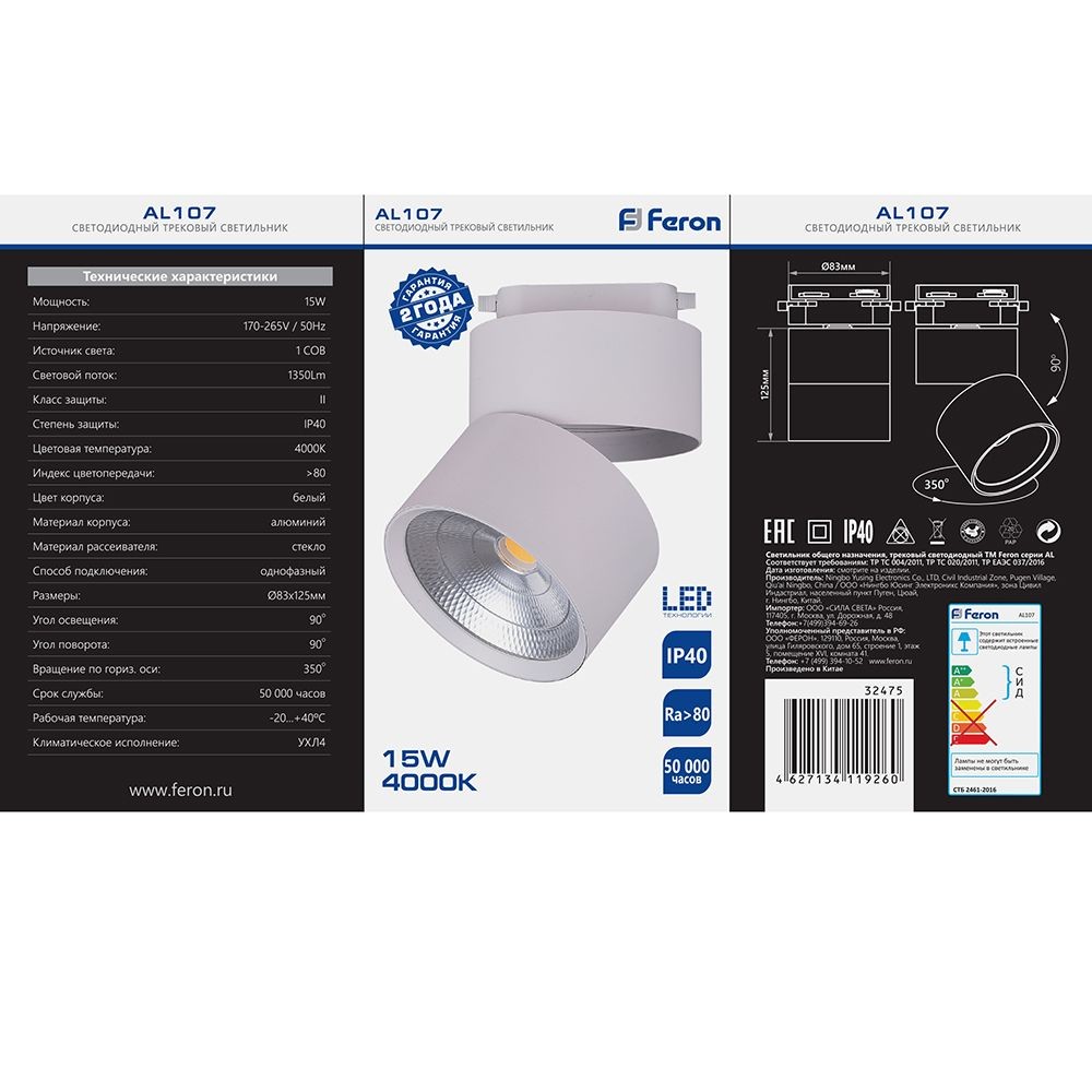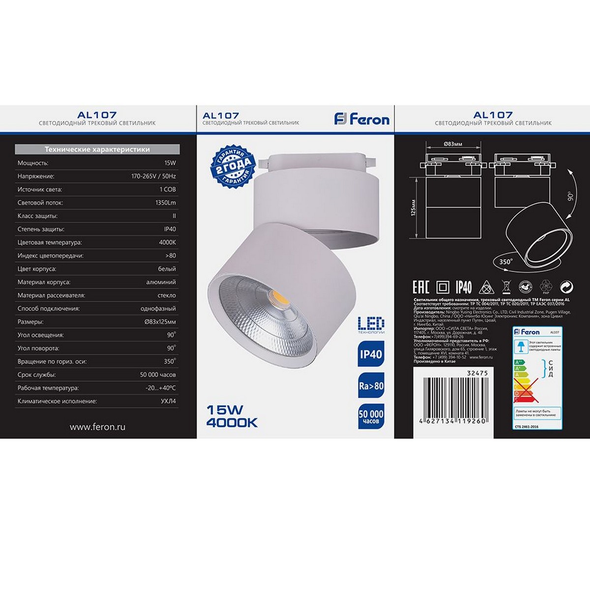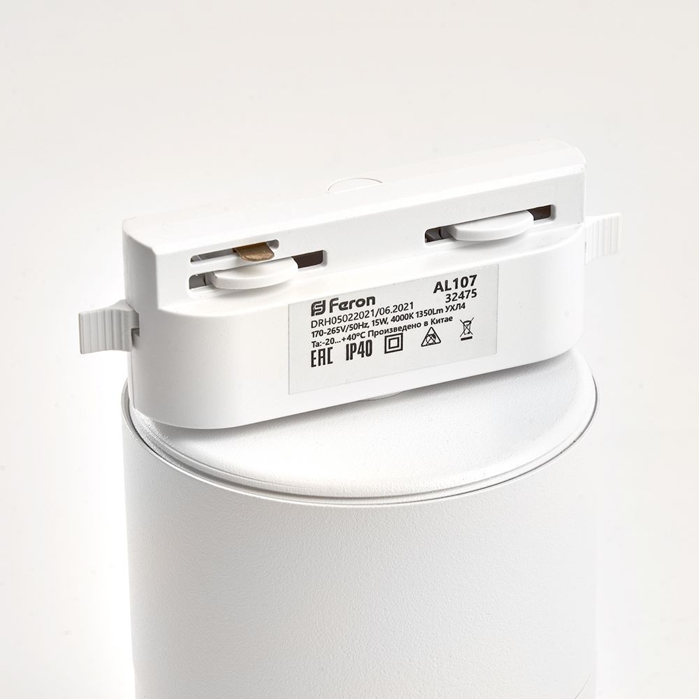Светодиодный светильник Feron AL107 трековый на шинопровод 15W 4000K белый 32475 по цене 1 382 руб. с фотографией и техническими характеристиками. Для покупки товара нажмите кнопку "Купить" и перейдите в корзину или позвоните по телефону 8 (495) 585 32 60 или 8 (800) 222 23 53.