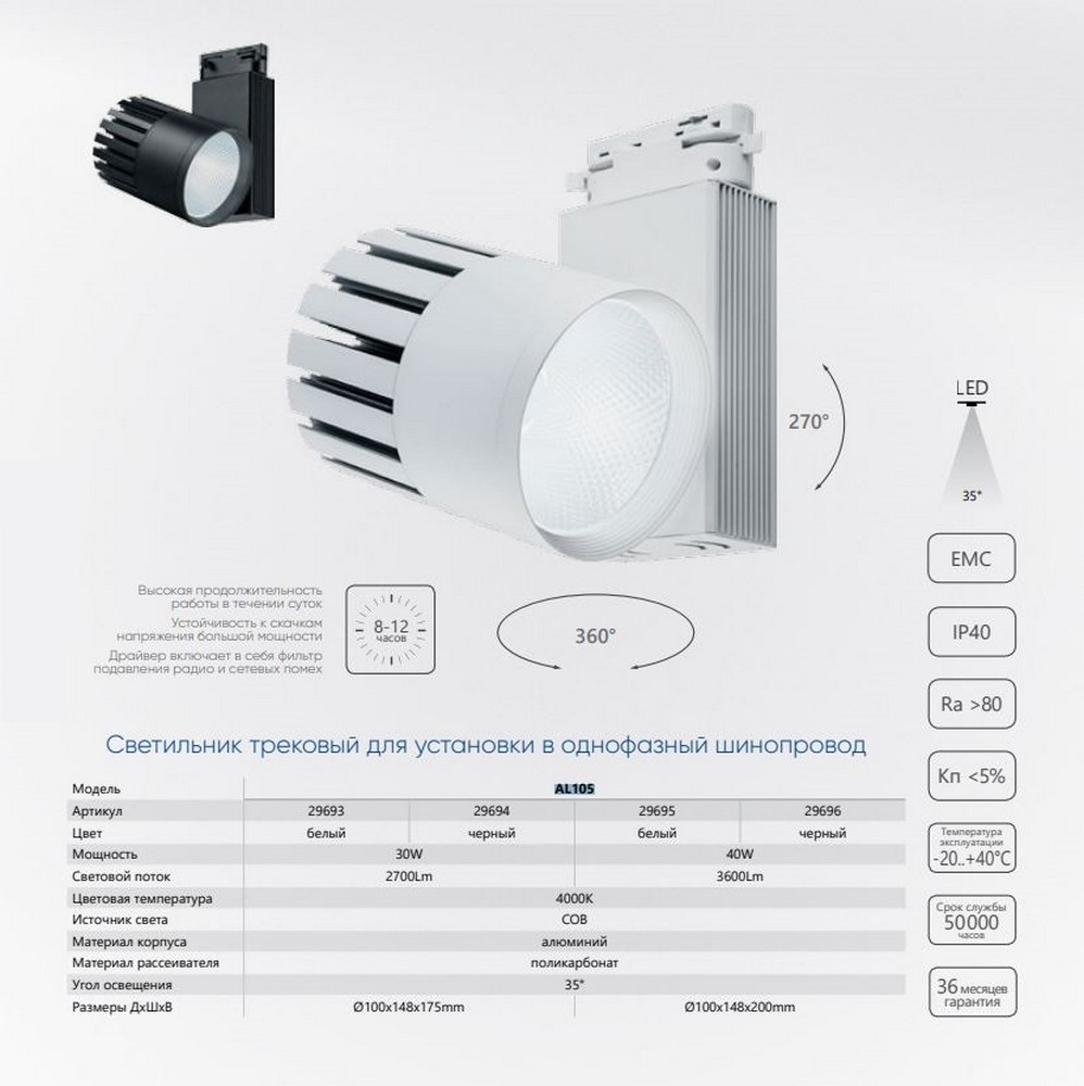 Светодиодный светильник Feron AL105 трековый на шинопровод 40W 4000К белый 35 градусов 29695 по цене 2 824 руб. с фотографией и техническими характеристиками. Для покупки товара нажмите кнопку "Купить" и перейдите в корзину или позвоните по телефону 8 (495) 585 32 60 или 8 (800) 222 23 53.