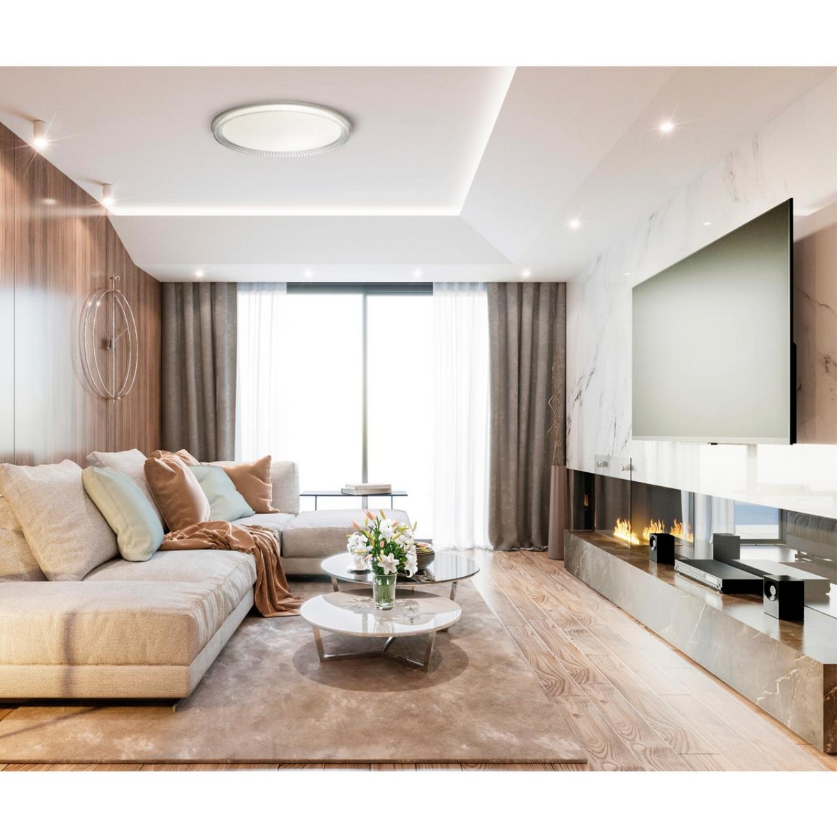 Светильник 7643/EL линии DEPAX состоит из металлического основания (базы) и пластикового рассеивателя. Материал рассеивателя - высококачественный пластик марки PMMA 2.0 белого цвета с гладкой матовой поверхностью, обеспечивающий светильнику равномерное рассеивание и хорошее светопропускание. Форма плафона: круглая, декорирована рельефным ободом из пластика прозрачного цвета. Благодаря прозрачному ободу светильник имеет увеличенный угол рассеивания света. Степень защиты IP43 позволяет использовать светильник в определенных зонах влажных помещений. В комплект входит заменяемый LED модуль с линзами, мощностью 70Вт, которая соответствует лампе накаливания 610Вт. А также пульт ДУ (с креплением на стену), с помощью которого осуществляется плавное изменение цветовой температуры 3000-6000К, изменение яркости, переход в режим переключения теплого/белого/холодного/ночного света. Светильник имеет функцию "память".