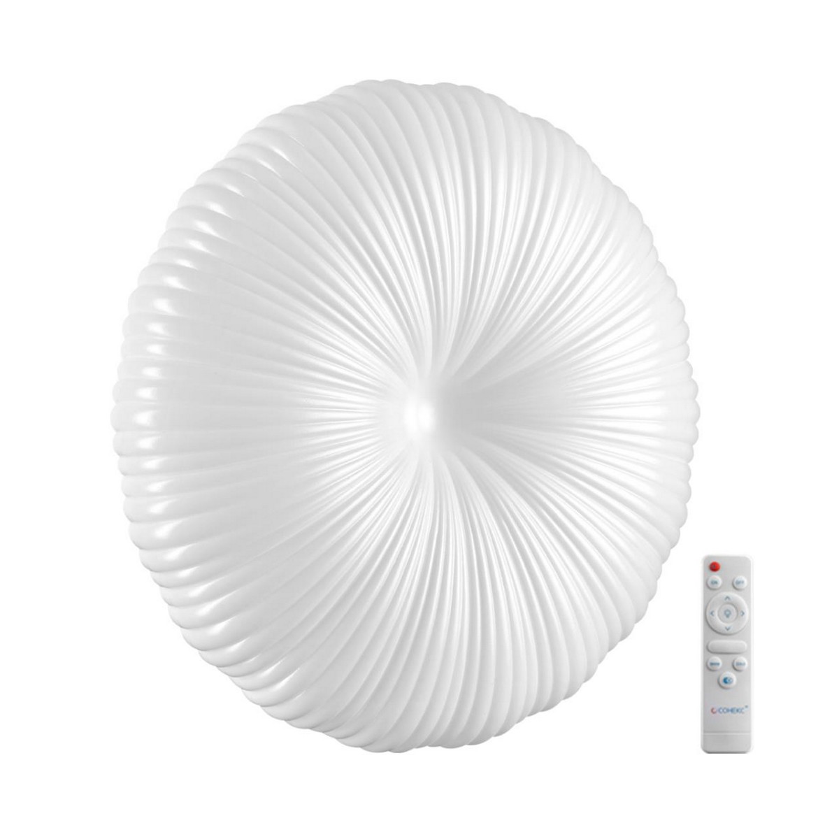 Светильник 7678/EL линии ANIX состоит из металлического основания (базы) и пластикового рассеивателя. Материал рассеивателя - высококачественный пластик марки PMMA 2.0 белого цвета с матовой поверхностью. Пластик обеспечивает светильнику равномерное рассеивание и хорошее светопропускание. Форма плафона: круглая, декорирована рельефом из пластика в виде узора белого цвета. Степень защиты IP43 позволяет использовать светильник в определенных зонах влажных помещений. В комплект входит заменяемый LED модуль с линзами, мощностью 70Вт, которая соответствует лампе накаливания 610Вт. А также пульт ДУ (с креплением на стену), с помощью которого осуществляется плавное изменение цветовой температуры 3000-6000К, изменение яркости, переход в режим переключения теплого/белого/холодного/ночного света. Светильник имеет функцию "память".