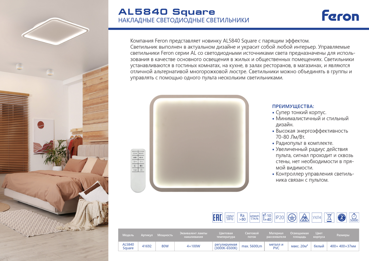Светодиодный накладной светильник Feron AL5840 мощностью 80W идеально подходит для создания качественного освещения в помещениях. С диапазоном цветовой температуры от 3000K до 6500K, он позволяет легко настраивать свет в зависимости от настроения или потребностей: от теплого до дневного света. Светильник обеспечивает яркость до 5600 Лм и имеет широкий угол рассеивания 120°, что гарантирует равномерное освещение. Корпус из штампованной стали и рассеиватель из металла и PVC обеспечивают долговечность и стильный внешний вид. Модель работает от сети 230V и имеет размеры 400x400x37 мм, что делает её подходящей для различных интерьеров. IP20 означает, что светильник предназначен для использования в помещениях. Встроенный светодиодный цоколь обеспечивает энергоэффективность и минимальные затраты на обслуживание.