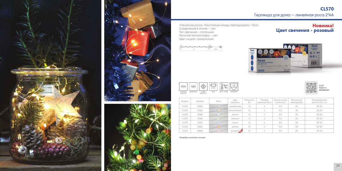 Гирлянда линейная от батареек FERON CL570, 20LED, 2700К (теплый белый), статичная (постоянного свечения), 2м+0,5м прозрачный шнур, расстояние между светодиодами 10см, IP20, 1,2W, на батарейках 2*AA, батарейки отсутствуют в комплекте, последовательное подключение - НЕТ